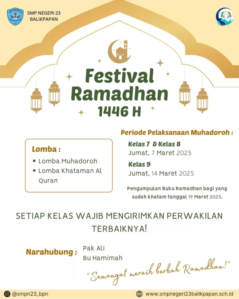 SMP Negeri 23 Balikpapan mengadakan Festival Ramadhan 1446 Hijriah. Apa saja sih Festival Ramadhan itu? Festival Ramadhan adalah serangkaian kegiatan yang diselenggarakan selama bulan suci Ramadhan untuk merayakan dan memperkuat nilai-nilai keagamaan, serta mempererat tali silaturahmi dan kebersamaan. Nah apa saja nih rangkaian kegiatan dalam Festival Ramadhan Spenduga? yuk simak sama sama.